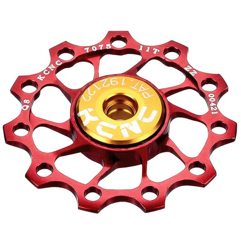 Diese ultraleichten Schaltrollen stellen das Maximum des technisch Machbaren dar, denn bei ihrer Herstellung wurden seitens KCNC alle Register in Bezug auf die Bearbeitung von Aluminium gezogen. Herausgekommen ist ein wahrer Höhepunkt der CNC-Fräskunst und damit eine Schaltrolle, welche hinsichtlich ihrer extravaganten und minimalistischen Optik, ihrer einzigartigen Funktionalität, sowie ihres geringen Gewichts keinen Vergleich scheuen muss. Für einen geräuscharmen und perfekten Rundlauf werden die Rollen aus hochwertigem Aluminium CNC-gefräst und anschließend mit einer farbigen Eloxalschicht nicht nur optisch veredelt, sondern auch deutlich haltbarer gemacht. Ein sehr reibungsarmer und präziser Lauf wird durch die Verwendung von hochwertigen und langlebigen Kugellagern erreicht. Bezüglich der Ausführung der Fräsung greift KCNC auf eine langjährige Erfahrung auf diesem Gebiet zurück und schafft es auf diese Art, den Schaltrollen einen extrem reduzierten Look und eine markante Optik mit hohem Widererkennungswert zu verleihen, der auch dein Bike zu etwas ganz Besonderem macht. Diese Schaltrollen sind ein Muss für alle Technikfreaks und Grammfeilscher! Passend für die Schaltwerke verschiedener Hersteller sind die Schaltrollen in den entsprechenden Zähnezahlen erhältlich. Eine Kompatibilität mit den gängigen Schaltwerken von SRAM, Shimano und Campagnolo ist somit gegeben.